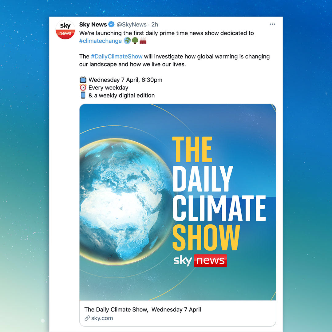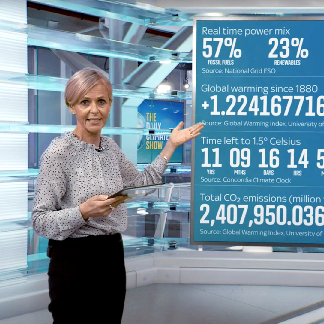 Brand Identity for the launch of The Daily Climate Show on Sky News. A brand new, cutting edge programme highlighting the immediate threat of global warming on the planet and efforts to find the solutions. Designed for an entirely virtual studio and to work across both broadcast and digital formats.